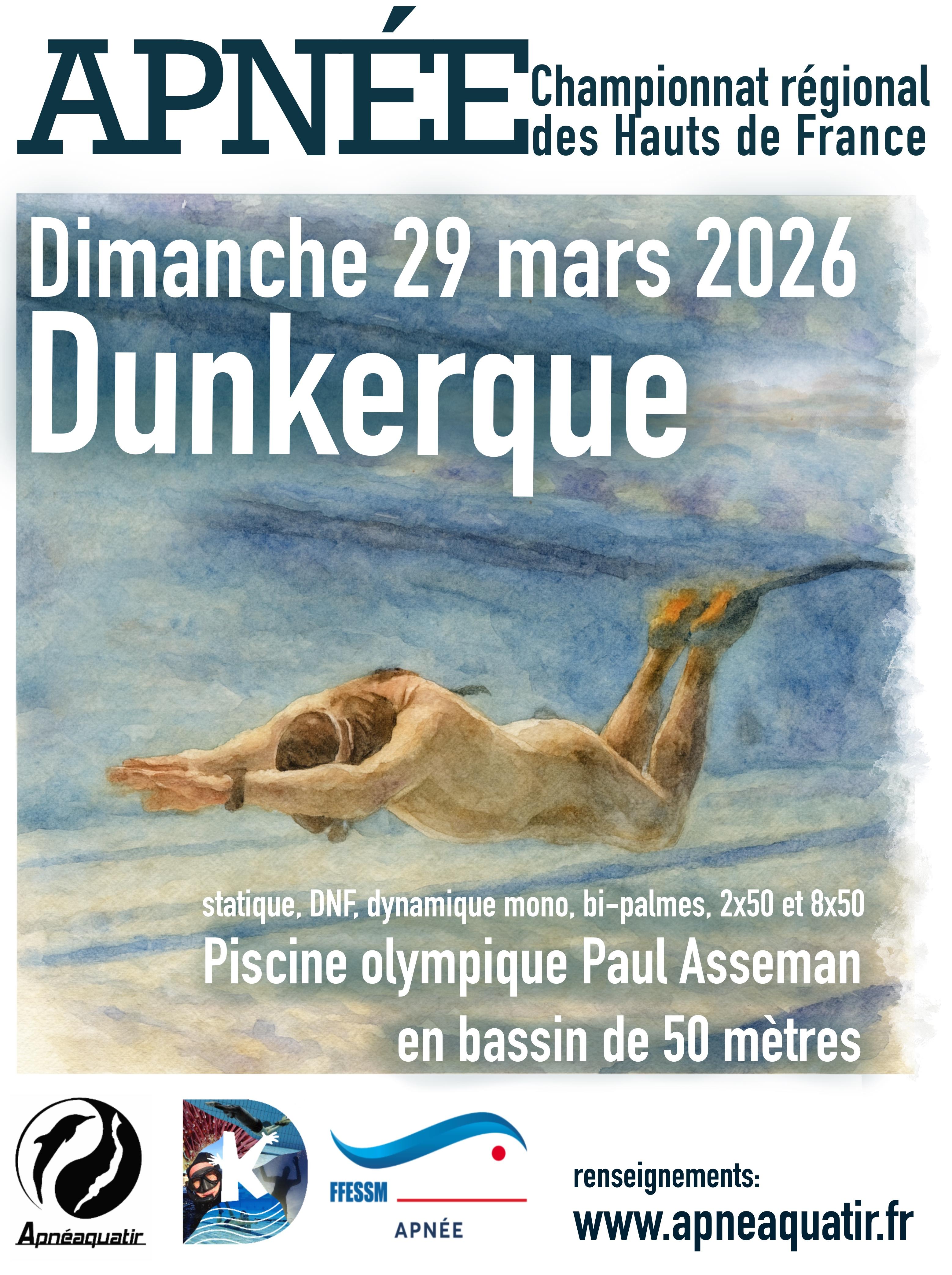 Le club Apneaquatir organise pour la seconde année le championnat régional des hauts de France , compétition sélective qui se déroulera le dimanche 29 mars 2026 à la piscine Paul asseman.